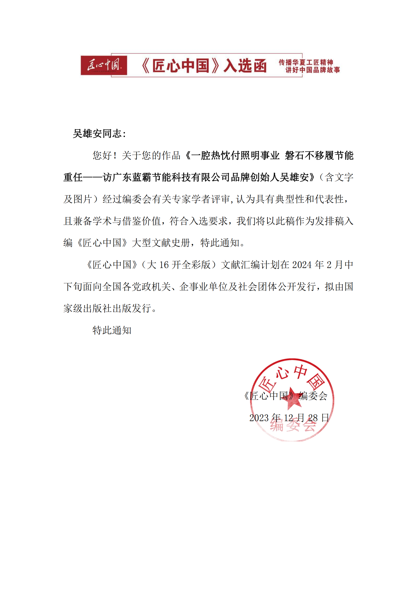 《一腔熱忱付照明事業(yè) 磐石不移履節(jié)能重任——訪廣東藍霸節(jié)能科技有限公司品牌創(chuàng)始人吳雄安》經(jīng)過編委會有關(guān)專家學(xué)者評審,認為具有典型性和代表性,且兼?zhèn)鋵W(xué)術(shù)與借鑒價值,符合入選要求,將以此稿作為發(fā)排稿入編《匠心中國》大型文獻史冊。……查看詳情